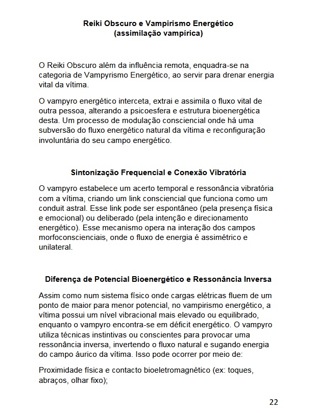 Reiki Obscuro é um sistema único, influência negativa remota, tão poderoso como o Vodú. Este método criado por Asamod Ka envolve manipulação energética, vampirismo energético, trabalho com as sombras, ritos com panteão sumério e egícpio com deidades trevosas. Desenvolvimento psíquico com dark psy balls, manipulação de prana obscuro, chama negra, sekhm negro.